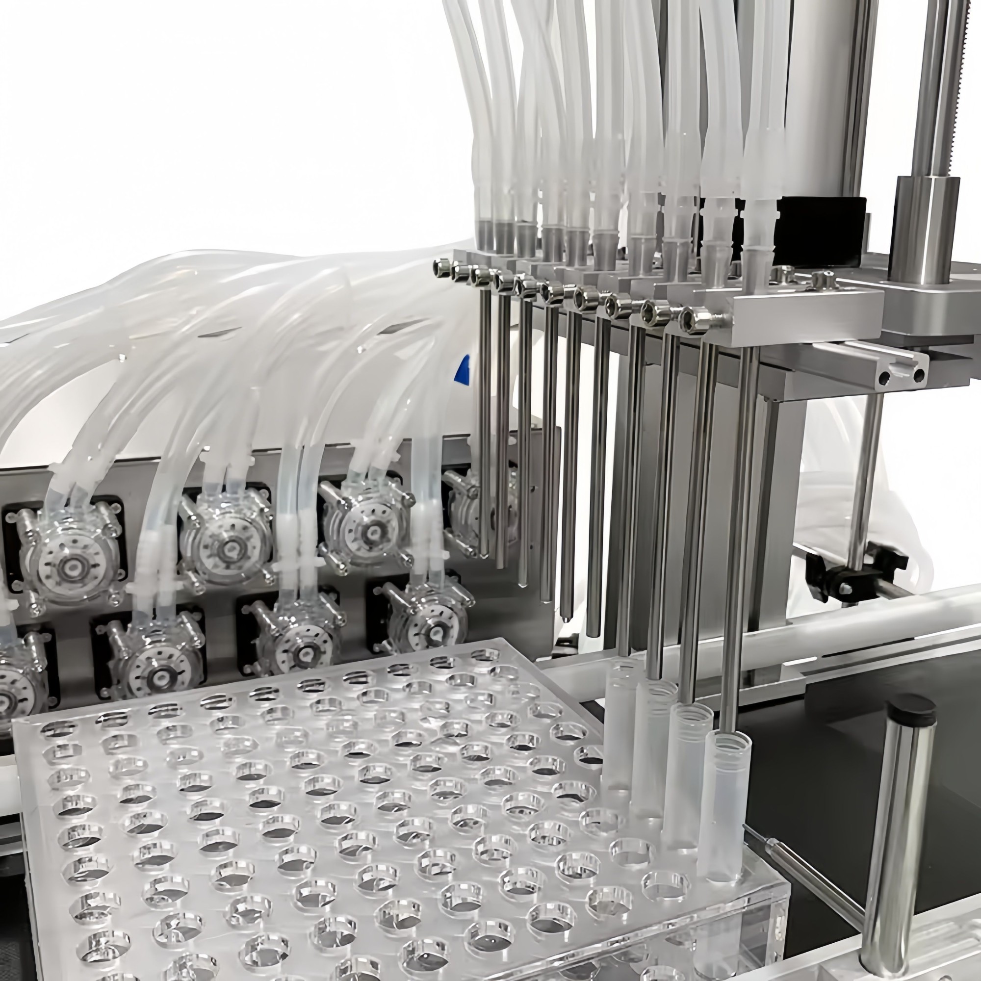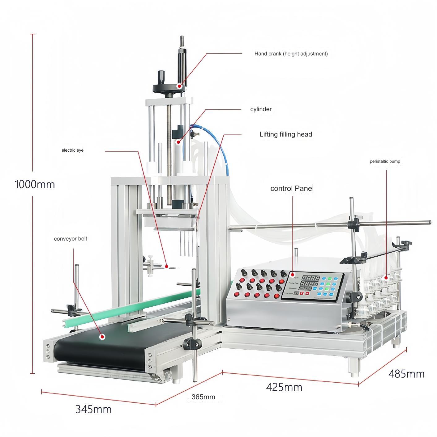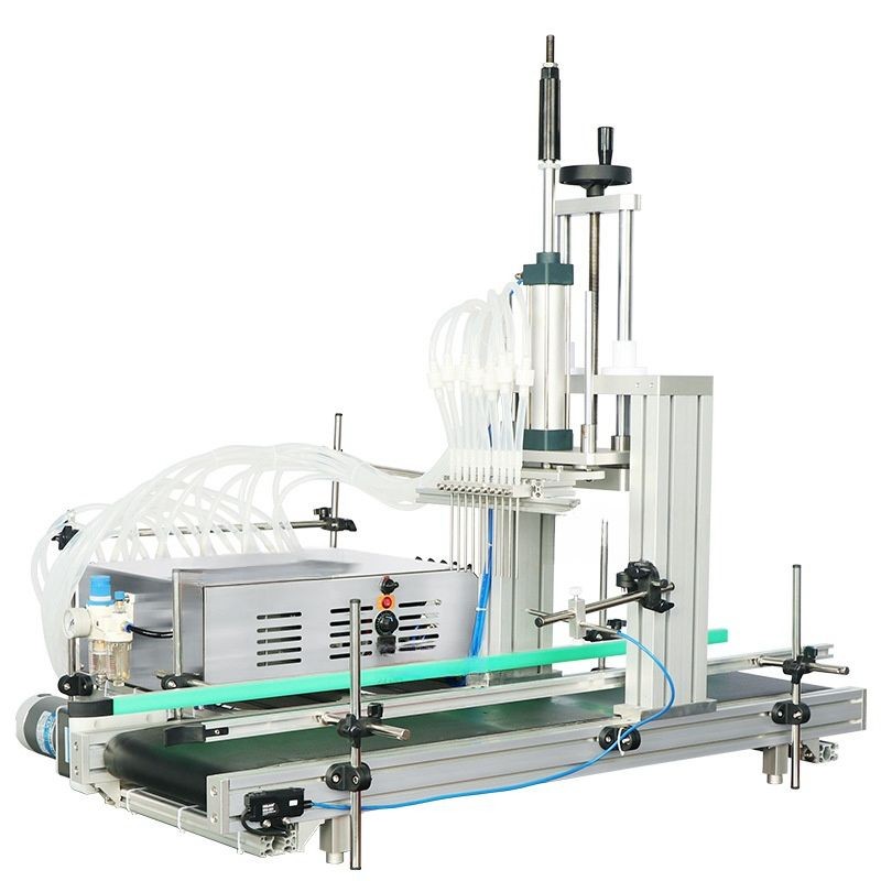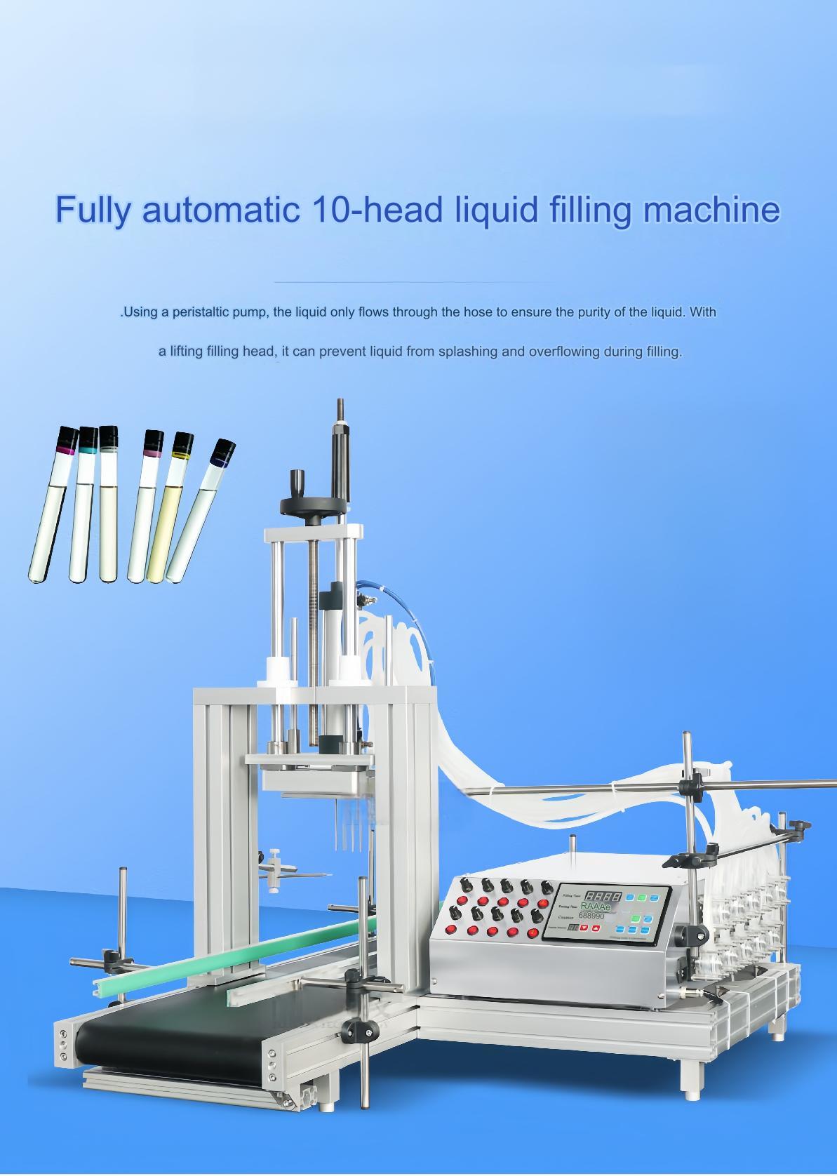The 10 nozzle peristaltic pump filling machine is designed with automatic conveyor belt to realize automated production.The diving nozzle can prevent from spreading out liquid during working.It is suitable for small volume liquid like eye drops,essential oil.Each nozzle of this machine can be controlled separately.The peristaltic pump can ensure the liquid quality and filling accuracy.