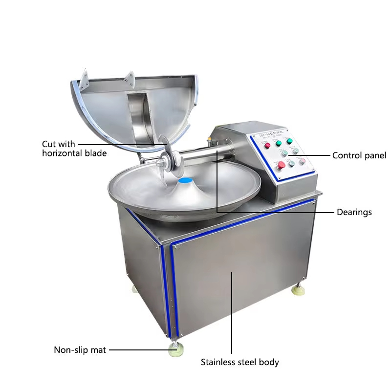 The whole machine is used for making cutting vegetable, meat, fruit and other fillings. The food cutter is specially designed for cutting meat and vegetables. The bowl cutter / chopper use the function of high speed rotary cut , make the meat loaf, meat, fat and other main materials into small meat or meat stuffing.