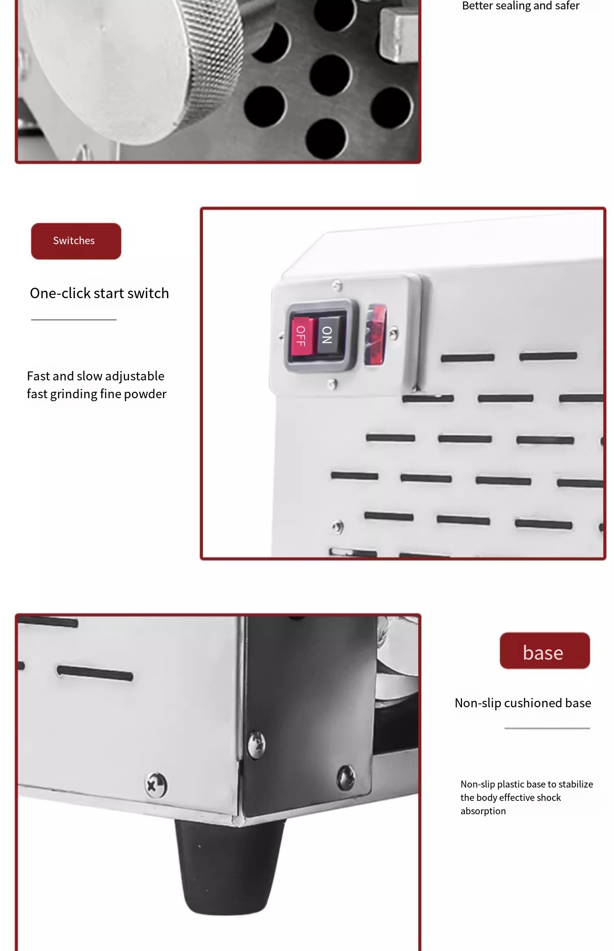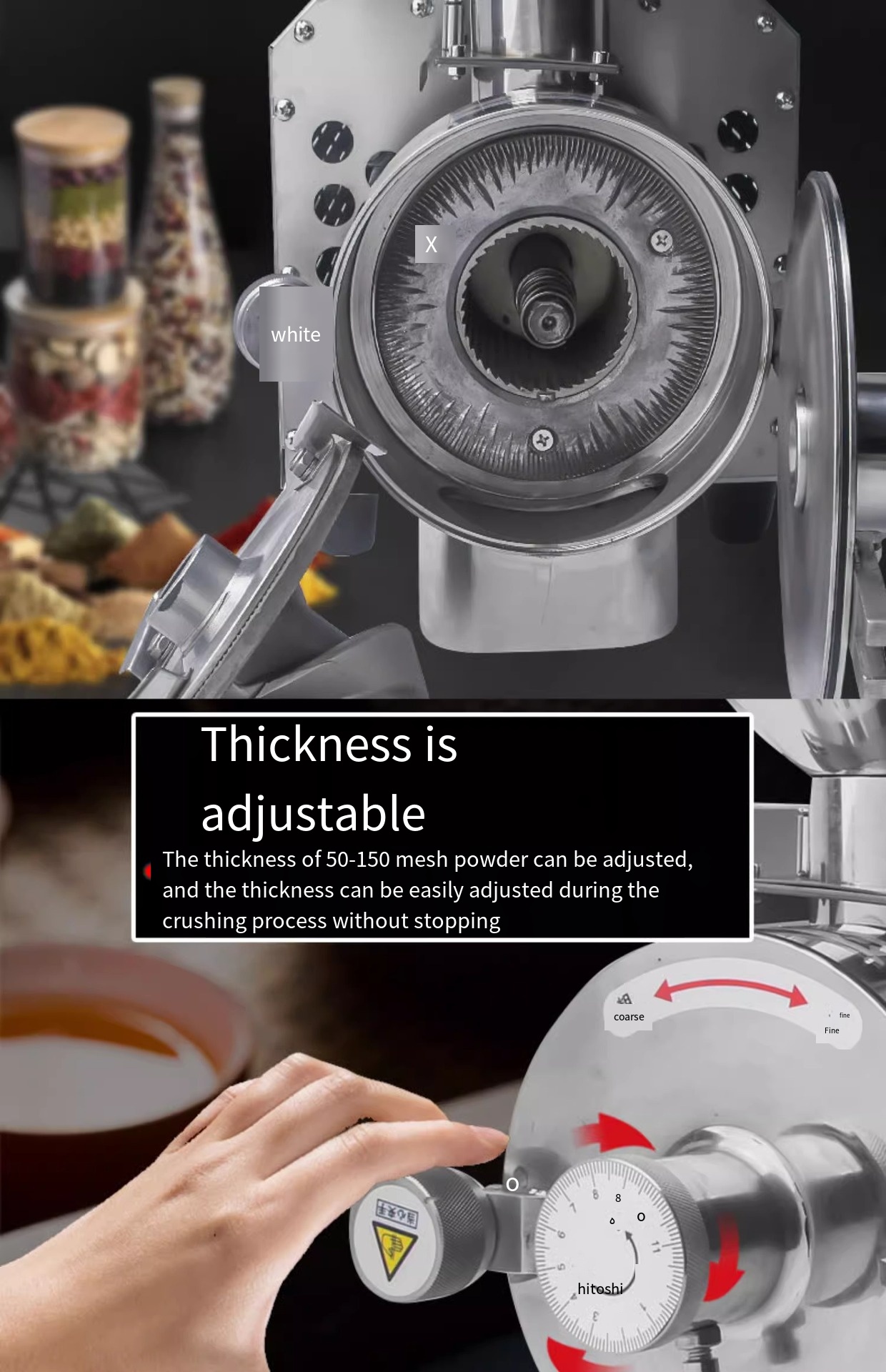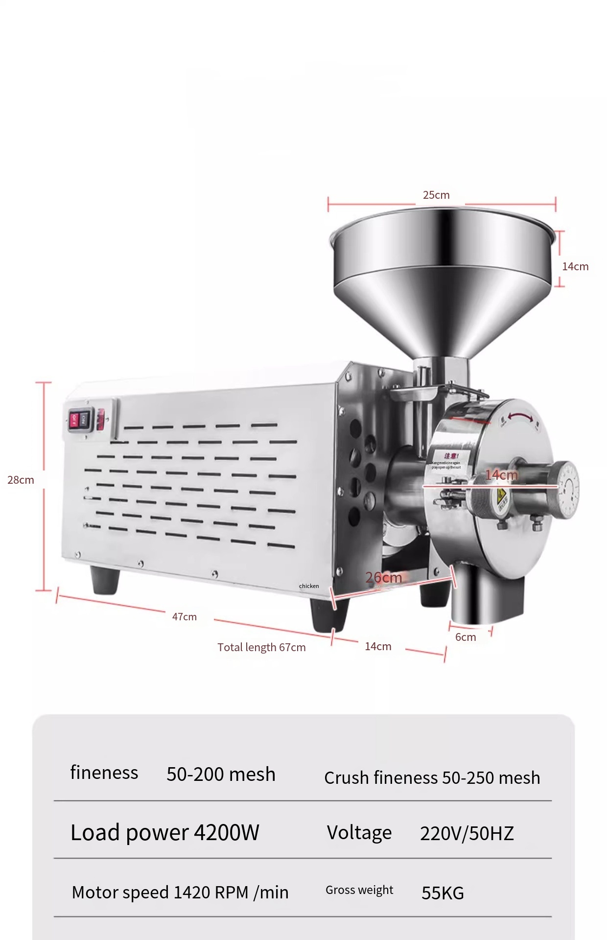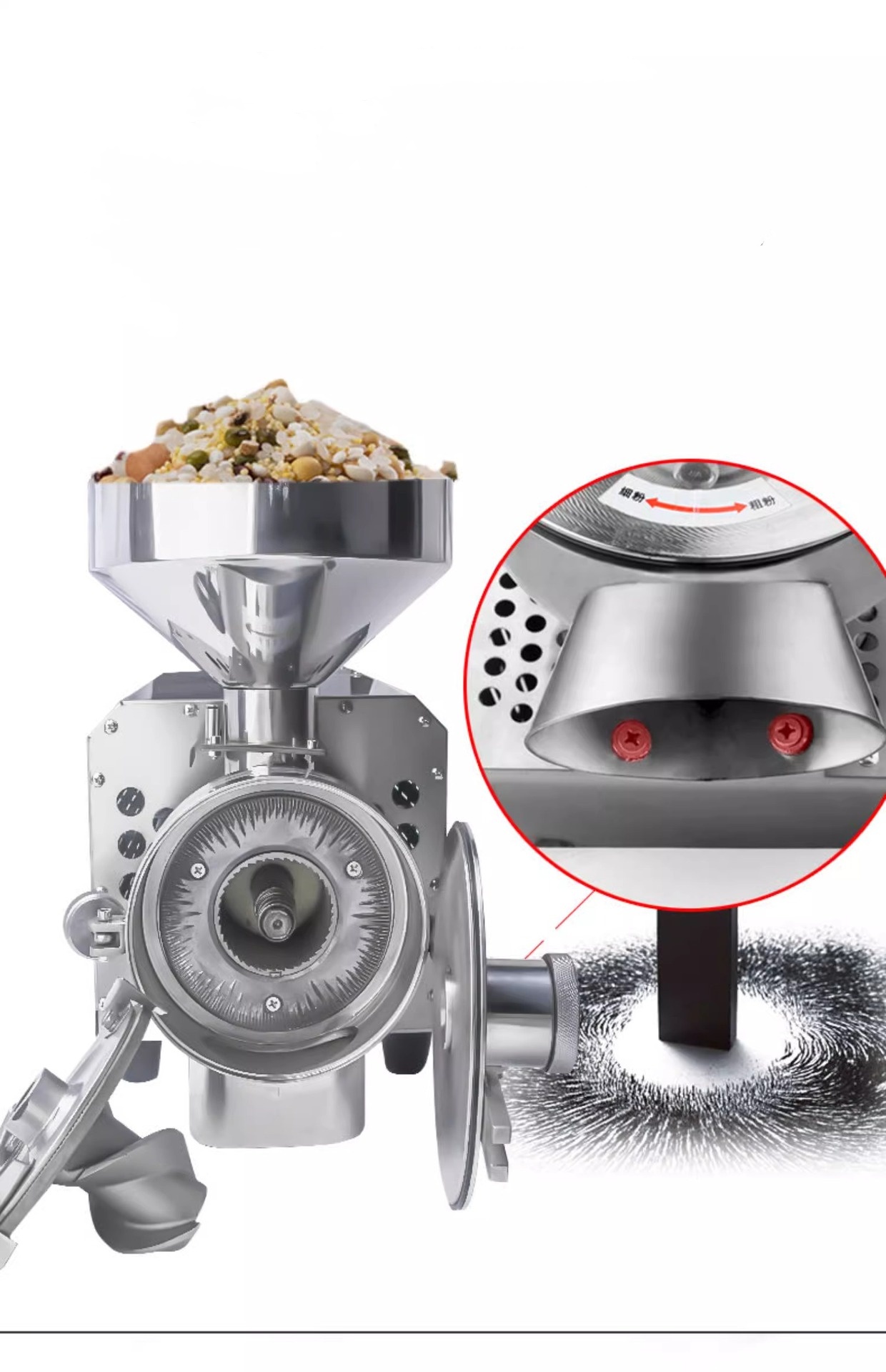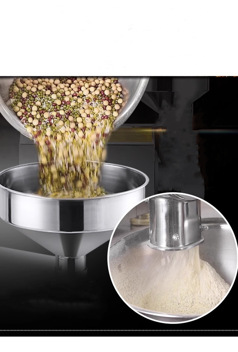 This grain mill is made of 304 stainless steel and driven directly by motor shaft, which can make the raw materials grind and pulverize quickly in a short time. The powder outlet is equipped with strong magnetic device, which ensures food hygiene and safety. The whole machine conforms to GMP standard.