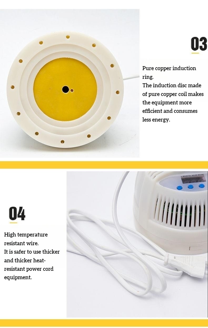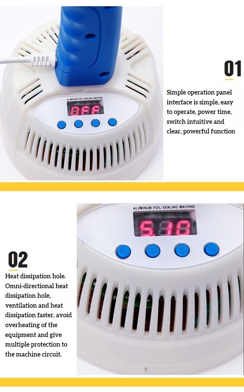continuous induction sealer aluminum foil sealing machine is a hand-held electromagnetic induction heating apparatus, specializing for the aluminum foil sealing of containers in pharmaceutics, chemical industry, pesticide, foodstuffs, cosmetics and light industry. Containers made of various materials are sealable. With small size, light weight, easy operation, it is suitable for low-volume production and operation in labs. The machine operates on the principle of electromagnetic induction: The aluminum foil on the bottle top is highly heated instantaneously and melted so that the bottle mouth is closely wrapped and sealed. The sealing is damp-proof, mould-proof, forgery-proof and theft-proof and prolongs goods storage time. The containers sealable can be made of PE, PP, PS, PET, ABS, glass, porcelain etc. but not metal. With Japan's latest modular power devices adopted, it is more economized in power and 20~30 times quicker in instantaneous heating than conventional vacuum tube-induced heaters, its heating efficiency being up to more than 90%